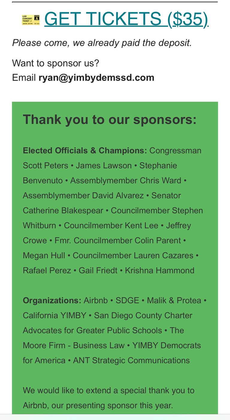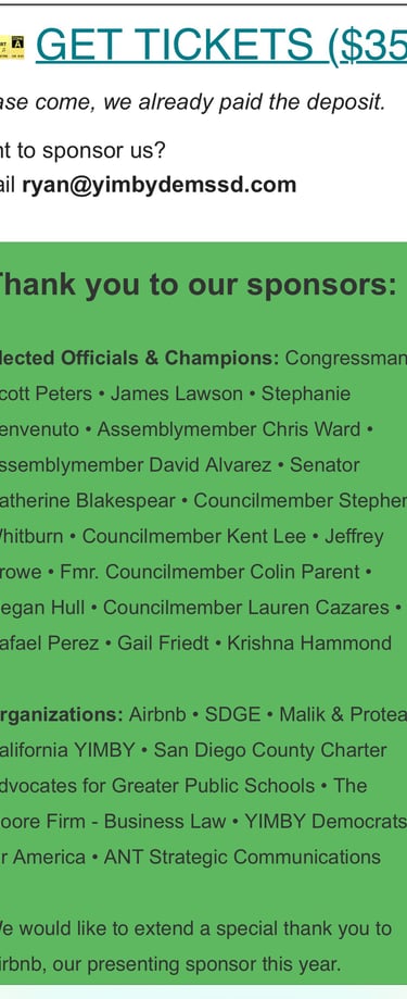 2025 Sponsor Organizations: SDGE, California YIMBY, YIMBY Democrats for America, Malik & Protea, two former Clairemont Planning Group Members now developers, and others. Presenting sponsor: Airbnb .